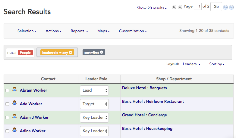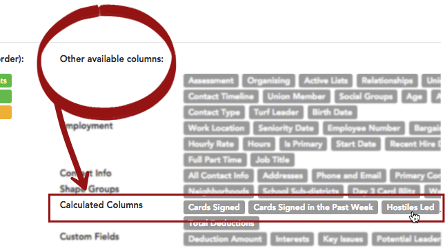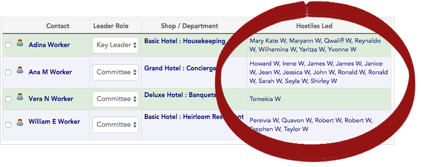 Calculated columns can be used to list multiple workers in a single column in your search results, for instance, to list each leader’s hostile workers (in a single field). This saved layout includes a calculated column showing a list of each leader’s hostile followers.