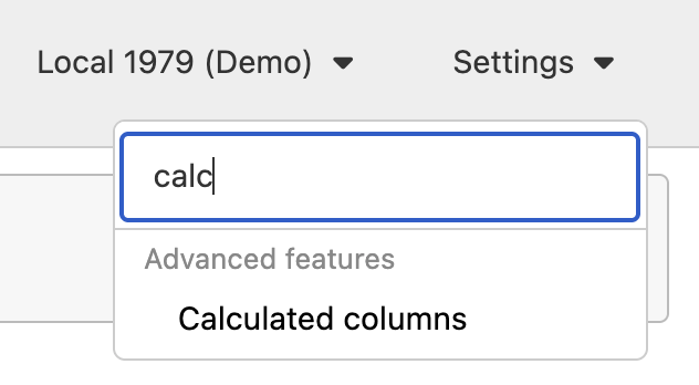 - Navigate to the Calculated columns settings page by clicking the Settings menu in the upper-right corner of the Broadstripes page, and then typing “calc” into the search box.