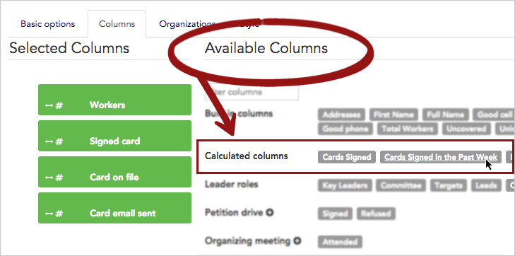 - You’ll see “Selected Columns” on the left and “Available Columns” on the right. Click “Cards Signed in the Past Week” from the Calculated columns section to add it to the report.