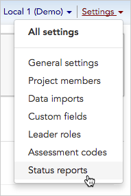 Now that we’ve created our new calculated column, we’ll add it to our status report.- We’ll open Status report definitions by clicking Settings > Status reports in the upper right corner of any page.