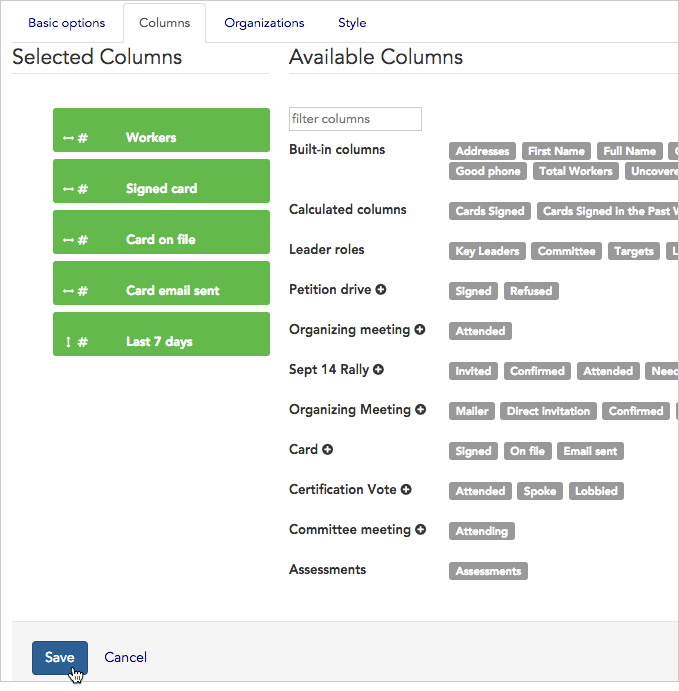 - On the Columns tab click Save again to keep the changes you made to your report. (On this page, you can also drag and drop the green Selected Columns to change the order they appear on the report).