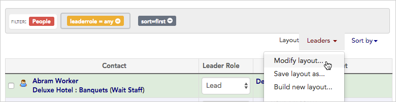 - Next, modify the layout to include the new calculated column. Choose “Modify layout” from the Layout drop-down menu. (Your layout name may differ from “Leaders” shown here.)