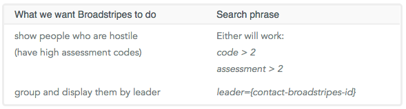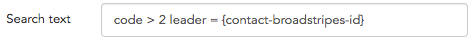 Tokens: When creating search text for calculated columns, anything inside{curly brackets} is called a “token.” In the search text “leader = {contact-broadstripes-id}” above, the token is used to tell Broadstripes to group and calculate the results by leader. It also specifies that the results should be reported separately for each leader according to the leader’s unique contact-broadstripes-id.