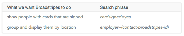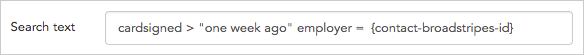Natural language: Broadstripes’ search tools understand natural language search phrases like “one week ago” or “two months ago.” Tokens: When creating search text for calculated columns, anything inside{curly brackets} is called a “token.” In the search text “employer = {contact-broadstripes-id}” above, the token is used to tell Broadstripes to group and calculate the results by employer. It also specifies that the results should be reported separately for each employer according to the employer’s unique contact-broadstripes-id.
