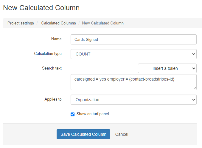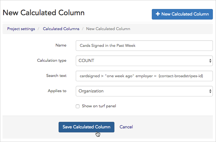 In this section, we’ll look at how to add a progress bar to a user’s turf panel to show the status of a card-signing goal using a calculated column. First, we’ll create the calculated column, specifying the data we want calculated. For this example, we want to see the number of cards signed by location. Once we create the calculated column, we’ll choose to have it show on the turf panel. It will automatically appear in a progress bar format, showing total cards signed as both a number and percentage. When we’re finished, the result will look like this:
