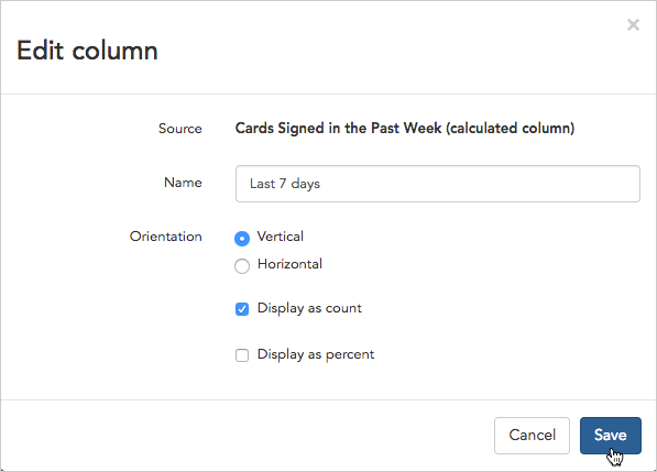 - We’ll choose a Vertical label orientation and choose to “Display as count” so we’ll see the total number of cards signed (rather than a percentage).
