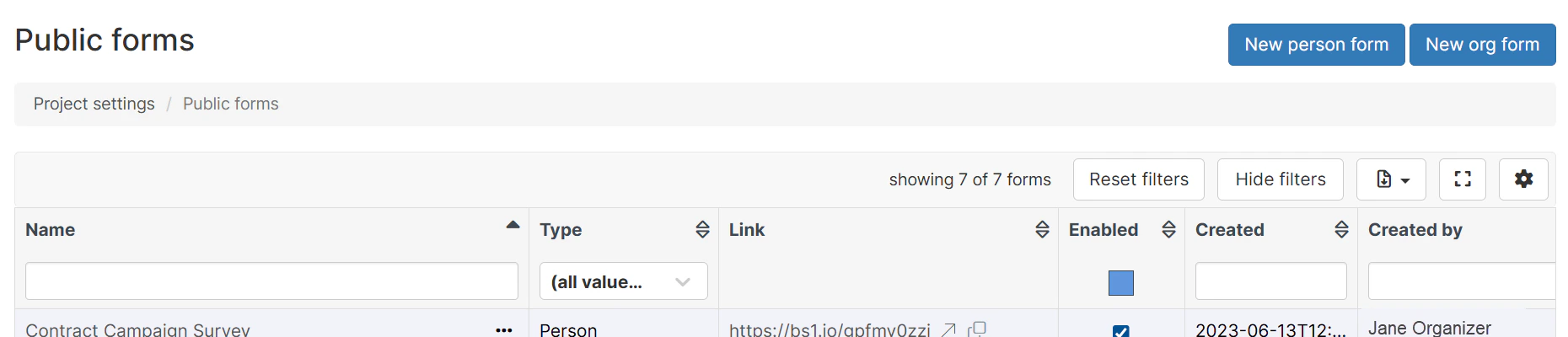 On the Public forms index page, click one of the buttons to create a form:- New person form - For individual contacts (workers, volunteers, members)