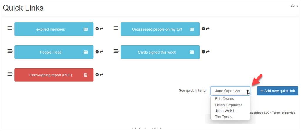 If you are an administrator, you can create quick links for other users. Select their name from the drop-down list (as shown below) and click the + Add new quick link button. When you’ve finished creating the new link, it will automatically appear on that user’s own quick link tab..