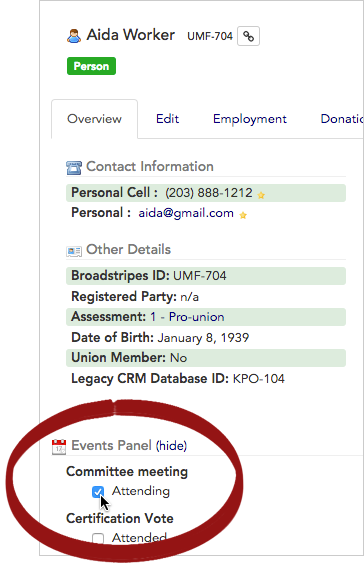 - On the Overview tab of Aida’s record, we’ll scroll down to the Events Panel and click the checkbox to show she’s attending the committee meeting.