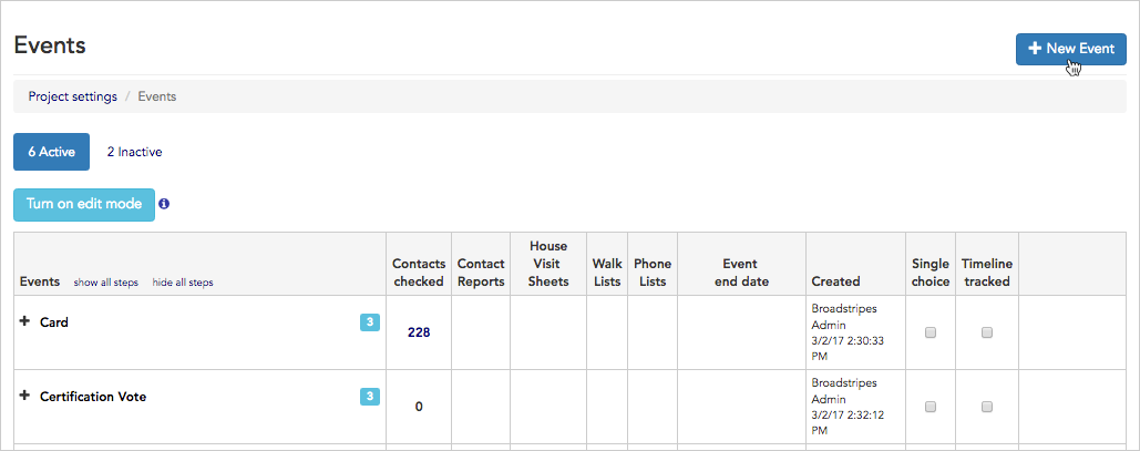 Typically, events are used to capture things that are transient: important now, but possibly less so in the future. You can use events to record and track literal organized events, but you can also use events to keep track of important one-time information or occurrences. As a rule of thumb, you should use an event to record information that occurred at a certain time, whereas you’ll use built-in fields (fields that come standard in all Broadstripes projects) or custom fields (special fields created by your admin) to record information that is always true. With most card-signing campaigns, once the election is won, that data will fade into history in the minds of the organizers, and new questions will become important. In these cases, events that are no longer relevant to your work can be made inactive to keep them from cluttering the project.Getting started with events