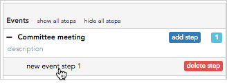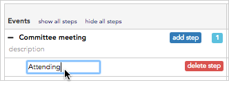 - Next, create a single step under this new event. Click on the text area labeled “new event step 1” below “Committee meeting.” Edit the text to create a step called “Attending.”