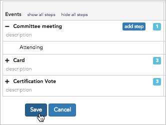 - To record attendance to an event for several different dates: for instance, an event called Committee meeting could have three steps labeled 3/1, 3/8, and 3/15.