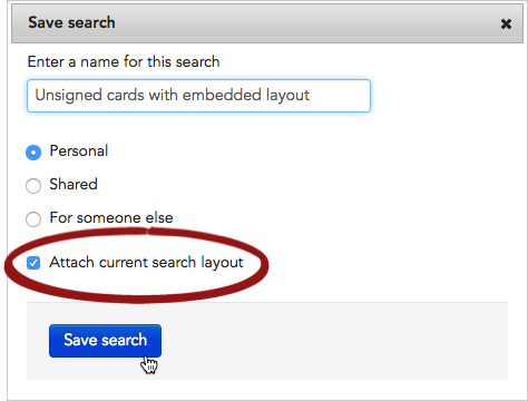 - Click Save search. The search (with its embedded layout) will now appear in the YOUR SEARCHES list in the navigational panel on the left-hand side of the page.
