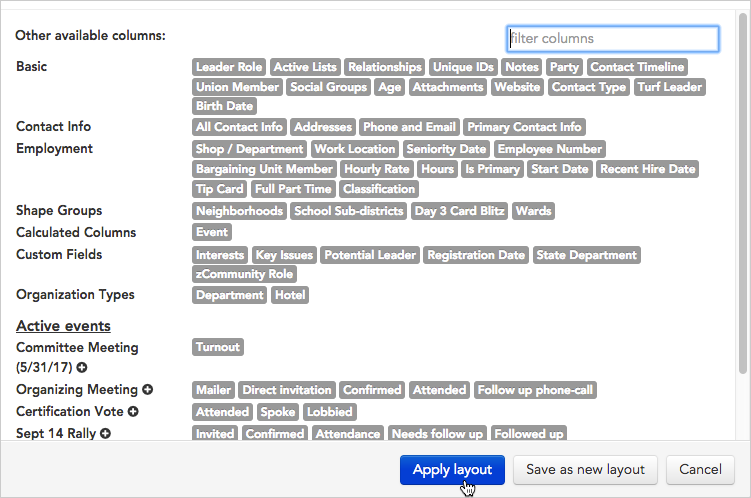 - From the list of columns that appears, single-click on the name of any column you want to add to your layout, then click Apply layout.