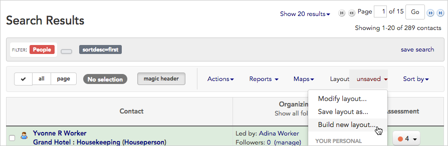 Together with searches, the Broadstripes layout feature is your key to viewing the records you want in a format that matches your process. While a search filters the set of contacts displayed by the criteria you choose, a layout determines which exact information to display about those contacts, and in what order. In short, layouts let you completely customize the contents of the search results panel, i.e. which data fields you see. You can choose just the columns of data you want, and leave out the ones that might get in the way. What’s more, you can create different layouts for different teams or tasks. By creating good layouts, you can view and record information in the most effective way possible. Once you’ve created a layout, you can apply it to any search results, any time. You can even share layouts with other users so whole organizing teams can work from the same set of crucial information.Create a layout