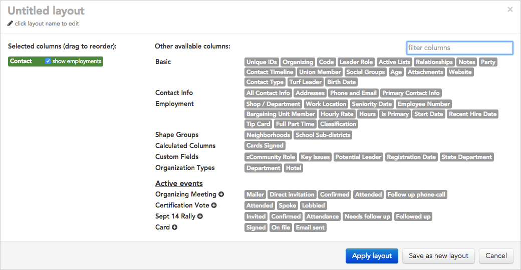 - For this example, we are going to create a layout that will help us run a card-checking campaign. We’ll choose some basic information about the workers as well as their employment info: