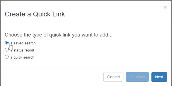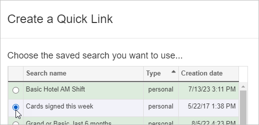 For this example, we want to add a quick link that shows us all of the people who have signed cards this week. We’ll create the quick link based on a saved search we’ve already made, and we’ll choose to see the results on-screen.