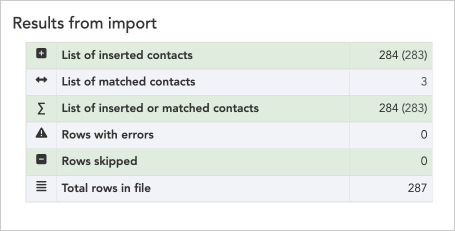 - ↔ (Matched) - Number of existing contacts matched by this import. These contacts were already in your database and may have been updated with new information.