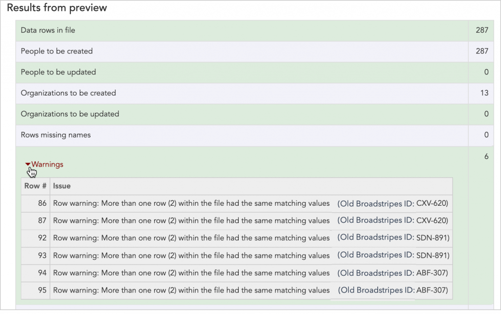 - Review any contacts that had warnings to ensure data quality