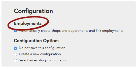 The Configuration panel offers you some choices about how Broadstripes should handle your imported data. Depending on how you’ve mapped your data in the previous step, you may see different options in the panel.Employments
