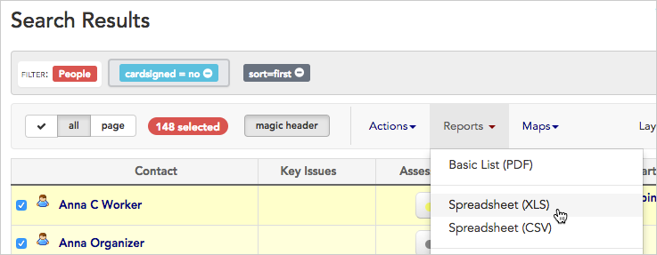 - Once your contacts are selected, click the Reports menu and choose the spreadsheet format you want: either Spreadsheet (XLS) or Spreadsheet (CSV).