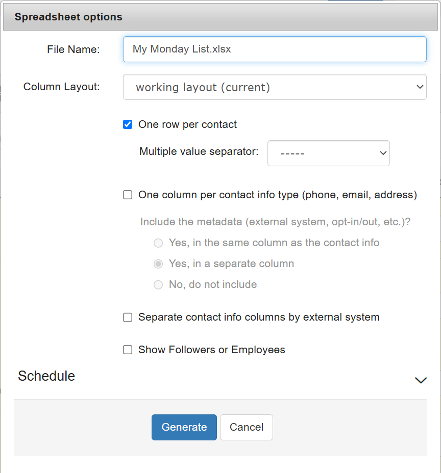 - Checking One row per contact will create one spreadsheet row for each contact; if a contact has multiple addresses they will each be listed together in the address column, separated by dashes (the same will happen for multiple employments or any other field that allows multiple values).