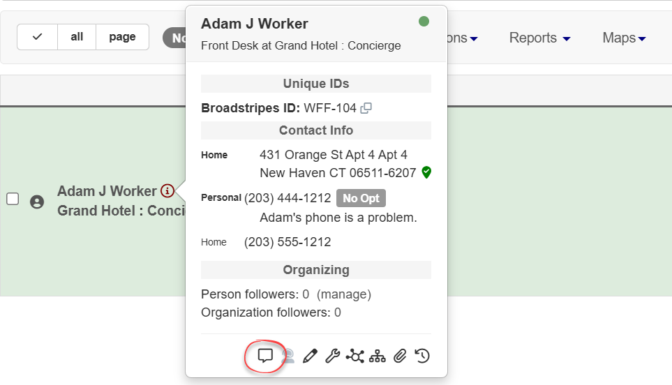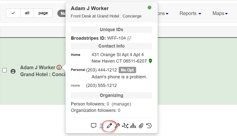 When you join an organizing project, you’ll use Broadstripes to record organizing information as you collect it. With Broadstripes, you won’t need to go to a special data-entry screen to record all that info — you can update any records you see on-screen at any time. This article will walk you through recording a range of organizing information for contact records that already exist in Broadstripes:- Check offs