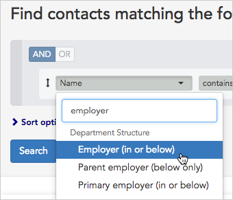 - To search by employer, select “Employer (in or below)” from the drop-down list on the left. That choice can be found under the Department Structure section of the drop-down list, but you can bring the choice up even quicker by typing “employer” into the Filter box (as shown below).
