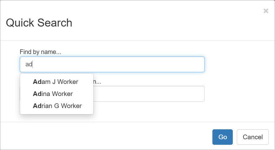 - Quick search will open in a new window. Start typing to Find by name (to find just one worker) or Find by Employment/location (to see all workers at a given location).
