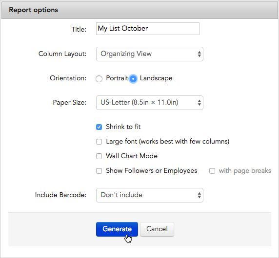 - When the Report options window opens, give the file a Title and choose a Column Layout to determine which columns of data (fields) will be included in your printed list. (For more information about using layouts, see the (../../get-started/choose-a-layout/) or (../../customize/save-a-layout/) articles.)