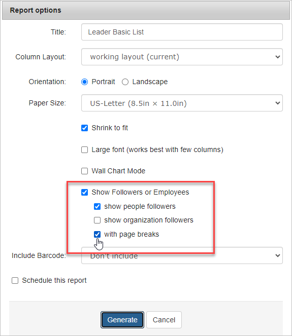 - When the Report Options pop-up window appears, name your spreadsheet and select the “Show Followers or Employees” option.
