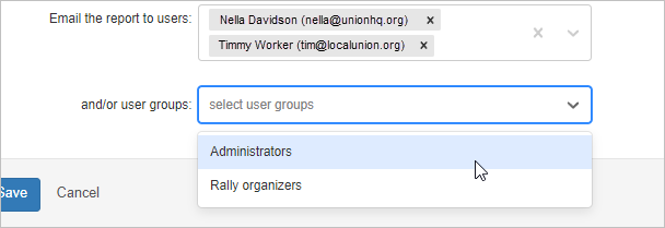 You can also email the report to project members or user groups post-generation. From the dropdown menus, select the project members and/or user groups you want to receive the report. The individual users and user groups you choose will receive an email with the report attached every time the report runs on the schedule.