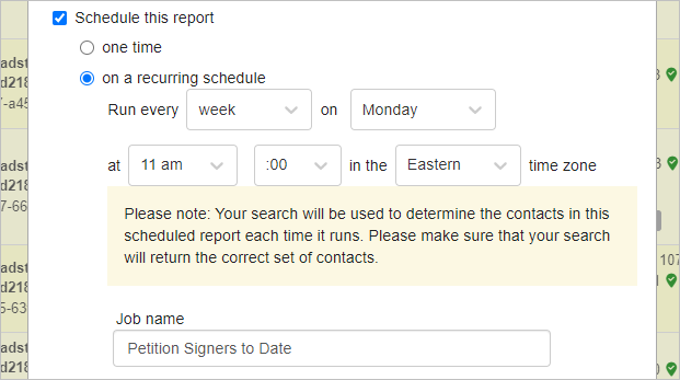 Search results reports may be scheduled for one-time generation at a future time or recurring generation. A one-time report uses static search results set during scheduling. Recurring reports are dynamic and fetch search results at the time of report generation. Search results list reports can also be scheduled to run and be emailed to you and other users. Here’s how:- Run your desired search and select the contacts you want to download.