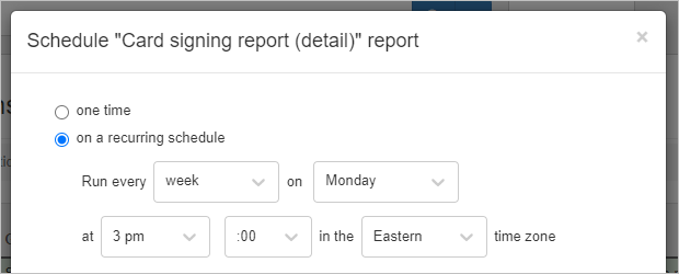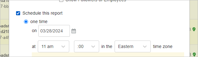 - For a one-time report scheduled in the future, choose “one time” and enter the desired date and time for report generation.