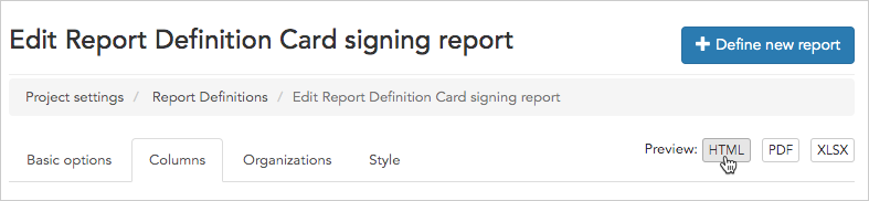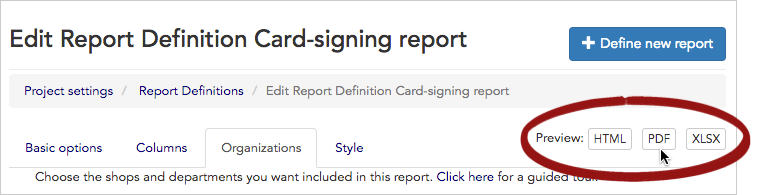 After saving, click HTML for an on-screen preview, PDF for a preview in PDF, and XLSX for a preview in Excel spreadsheet format.