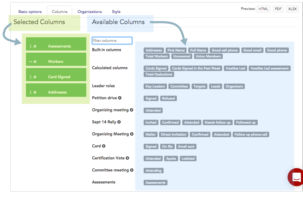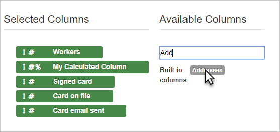 The “Available Columns” choices are organized by category:- Built-in columns reference (../../../admin-tools/data-tools-admin/built-in-data/) like name, and contact info.