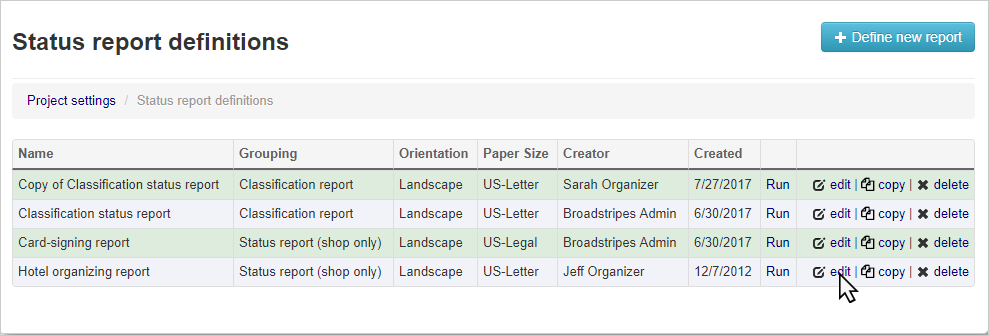 Once you have status reports set up, here are some options for working with them.Run – This will re-run any status report with new, updated information. This means you can use the same parameters as the original report with updated progress, instead of going through the entire process of creating a new report. edit – This will bring you back to the Create a status report page and allow you to change the report options. Move through each of the setup tabs as needed (Columns, Organizations, Style) and save as you go. You can then run the report again to see updated numbers. copy – This will leave the selected report intact, and create a new copy. A pop-up will display telling you to enter a name for your new report. The default will be “**Copy of **,” but you can change it to anything other than the name of the original report. Click OK when you’re satisfied with your new report name and the copy will appear in the Status report definitions list. To make changes to your copied report, click edit. x delete – You can delete a report by using the delete button all the way to the right. Don’t worry, you’ll be asked to confirm your request before Broadstripes deletes your hard work!Once you’ve run a report, you can download it as a PDF by clicking the View as PDF button at the top of the report.