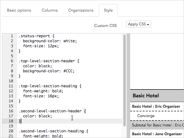 If you want to make any custom style changes, you can get started by clicking the last tab, labeled Style. To change the look of the report, Broadstripes allows you to apply custom CSS code by adding it to the code area on this page as shown below.
