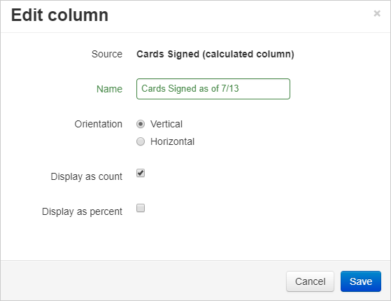 You can use the Name text box to rename any column to display on your report with a different header. For instance, you could select the “Cards Signed” column, and then change the name to display “Cards Signed as of 7/13”. This can be useful when you want to convey your information more legibly, or emphasize the timeline of your progress.