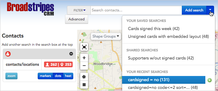 Running a search from the maps page will find a specific group of contacts according to any criteria you choose — then display them on the map. For this example, we’ll use the map to decide where to start a card drive. We’ll run a search to find where the highest density of unsigned cards is, and target that area first.- We’ll start by running a recent search for everyone in our project who hasn’t yet signed a card. (Learn more about creating custom searches like this in the Search articles).