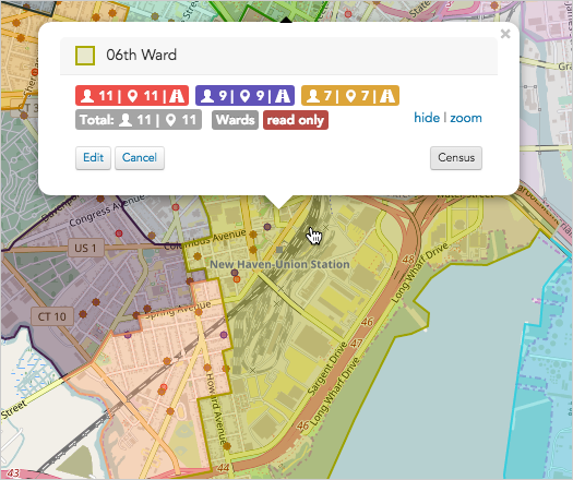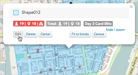 A shape is a user-defined area of the Broadstripes map (for instance a voting ward, neighborhood, or school district). Any people in your project who are located within a shape you’ve drawn are considered a part of that shape. Broadstripes allows you to create your own shapes – for instance, to define house-visit assignments or manage other neighborhood-based organizing. This is sometimes called cutting turf. Broadstripes can also provide complicated pre-made shapes, like state legislative districts, whose borders are defined by law, and may change over time.Shape groups