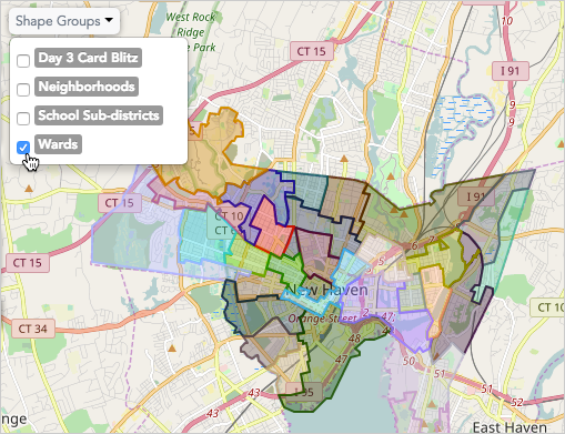 - Choose the shape group you want displayed on the map by clicking thecheckboxnext to its name. For this example, I’m interested in comparing the number of voters in each of the city’s wards, so I’ll checkWards.