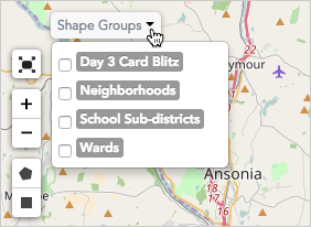 Once they are set up, shapes provide a simple way to navigate and assess your contacts by their location.- To see groups of people using the shapes feature, start by clicking theShape Groupsdrop-down menu in the upper left-hand corner of the map. (For help getting to the map page, see themaps overviewarticle.)