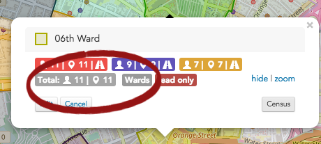 - Red shows everyone in our project. (There are 11 people in the 6th Ward shape.)
