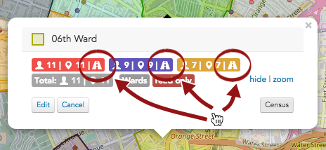 - Each shape is defined by an outline and a unique color. To get detailed information about the people located inside a certain shape, just mouse-over the map andclick anywhere on that shape.