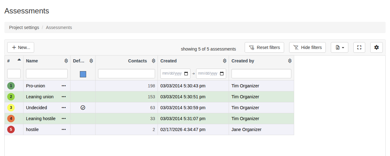 - The Assessment codes table will open, displaying all of the codes you have set up to measure workers’ support in an interactive data grid. You can sort, filter, and manage your project’s codes from this page.