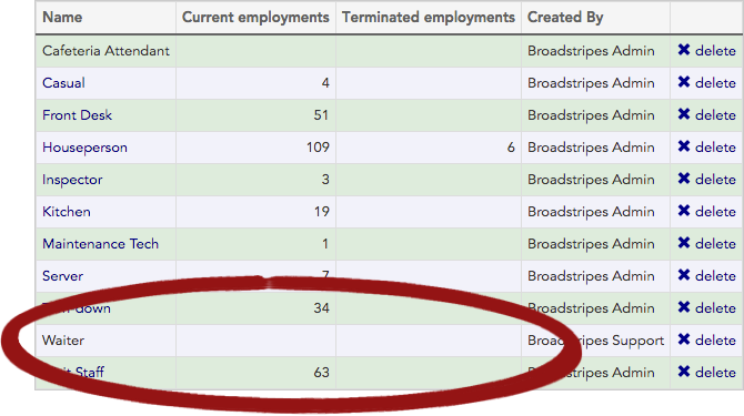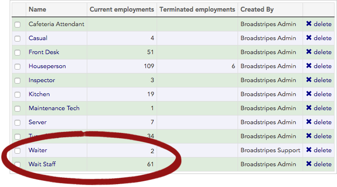 Job titles are created through the process of assigning employments to workers. As with any data entry work, sometimes errors or duplicate entries are made during the process. You can use the Job title index page to quickly find (and fix) mistakes in your job titles. In this example, we’ve found a duplicate entry on our Job titles index page: there are people assigned the job of “Wait Staff” and “Waiter,” but they should have all been called “Wait Staff”. We’ll look at which workers are affected, and how to properly clean up this mistake.- Since the job title “Waiter” is a duplicate of “Wait staff,” we want to delete it from our list. But first, we need to re-assign any associated workers to a valid job title. You can see from the list that there are two workers we’ll need to update.