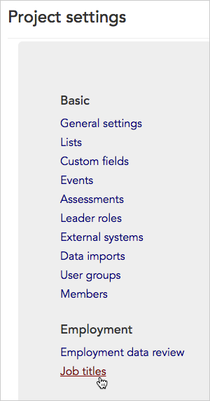 - From the Project settings page, click the Employment > Job titles link (depending on your settings, this might be labeled “Classifications” rather than “Job titles.”