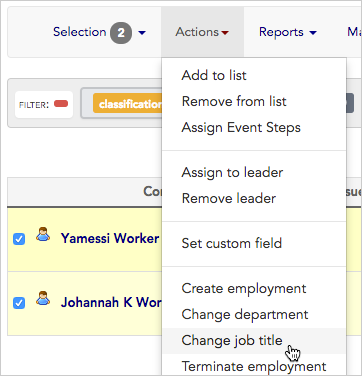 - Next we’ll choose Change job title from the Actions menu, and change their job title to “Wait staff”. You can read detailed instructions on changing job titles in the Bulk Actions section of the Bulk Actions article.