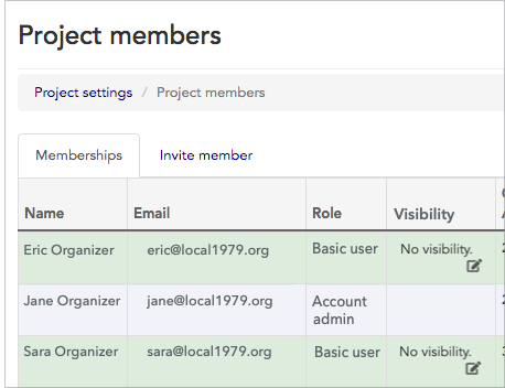 Sometimes an organizing team will include activists or volunteers who aren’t well-known to the team’s leadership or who, for other reasons, simply shouldn’t have full access to the project’s data. When this is the case, you can turn on Broadstripes’ “Limited Visibility” feature in your project. When the limited visibility feature is “on”, project admins can still see all the records in the project, but basic users can only see the people and organizations you make “visible” to them. This article covers managing basic users’ visibility settings. If you’d like to learn how to turn on the limited visibility feature or the temporary visibility, check out the general settings article.View your basic users’ limited visibility settings